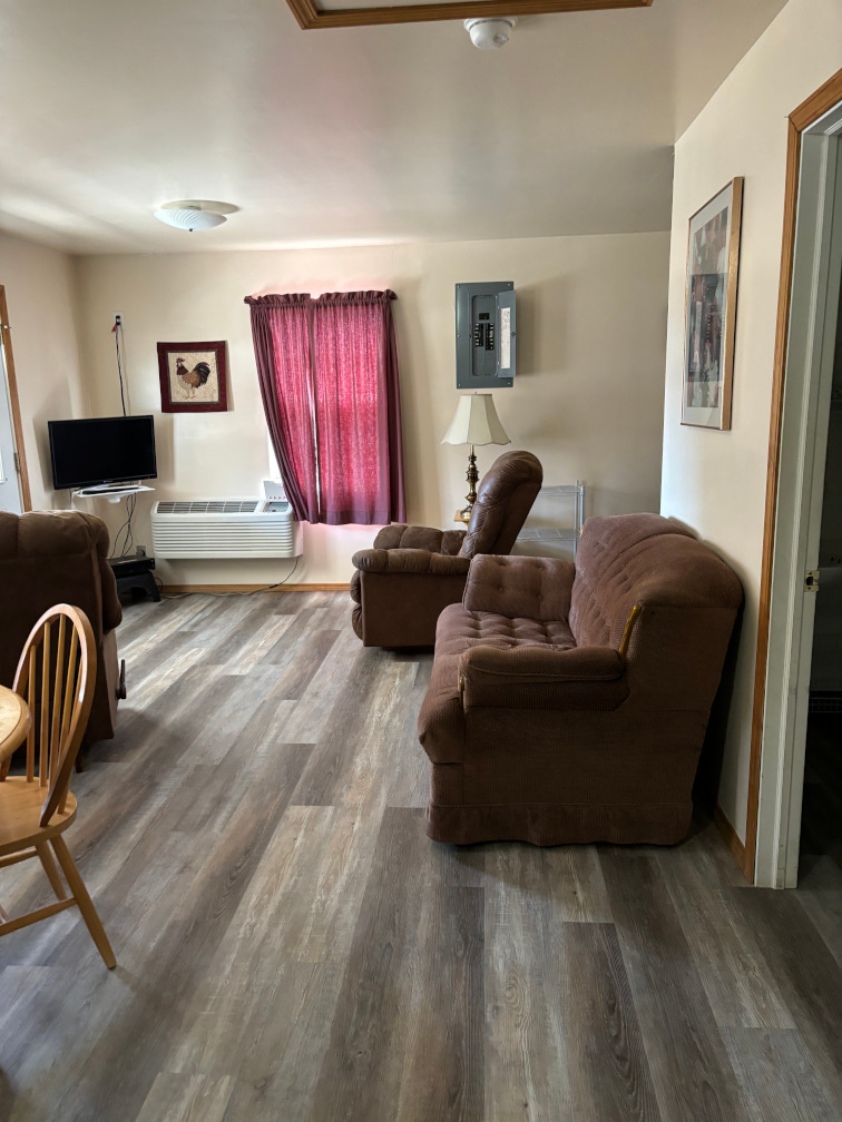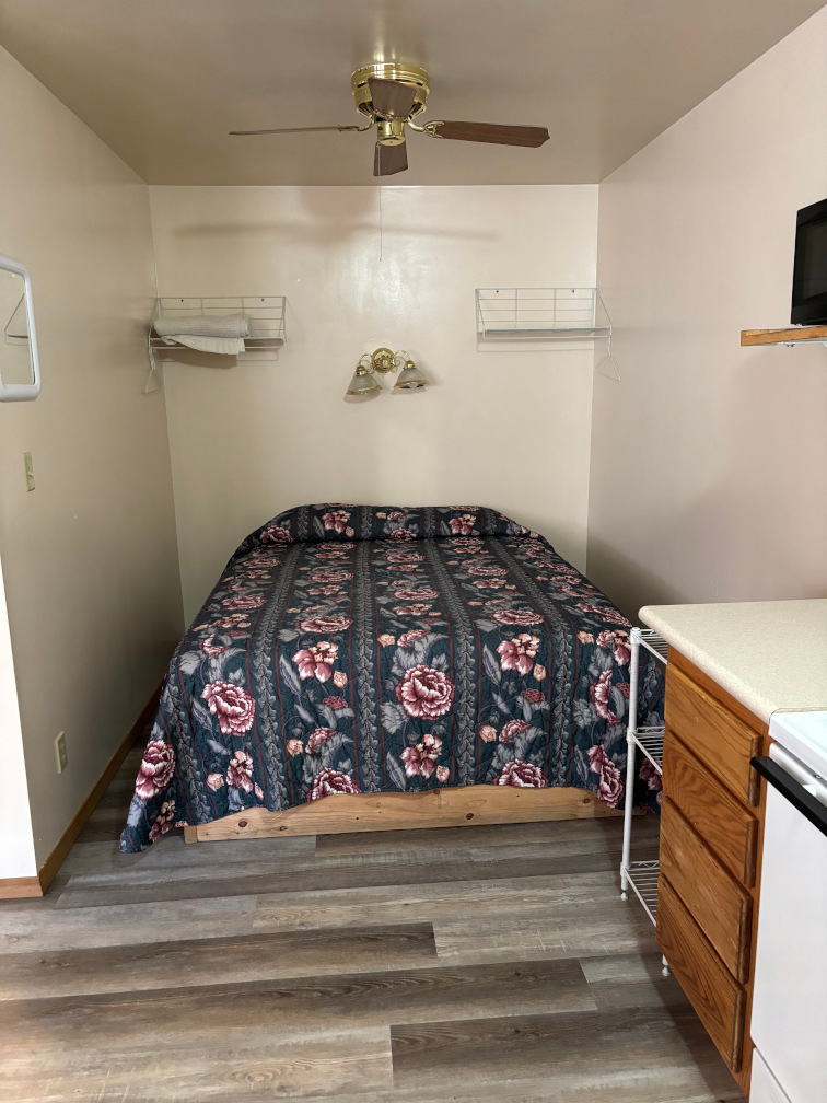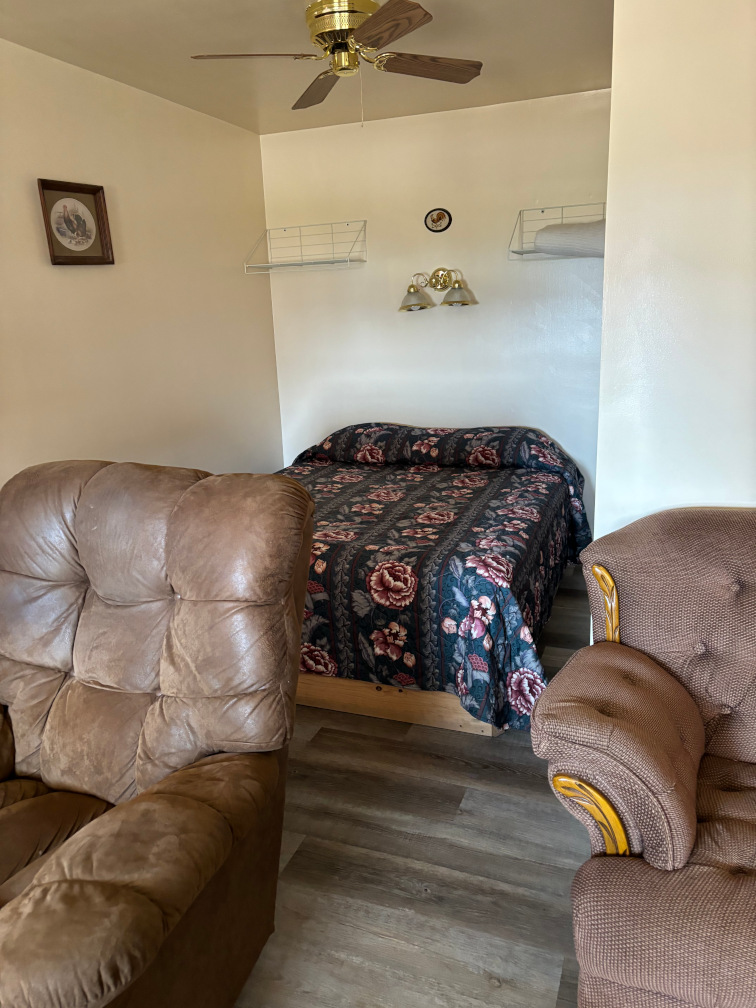 Open floor plan with 2 queen sized beds, lake view, covered deck and walk up ramp.