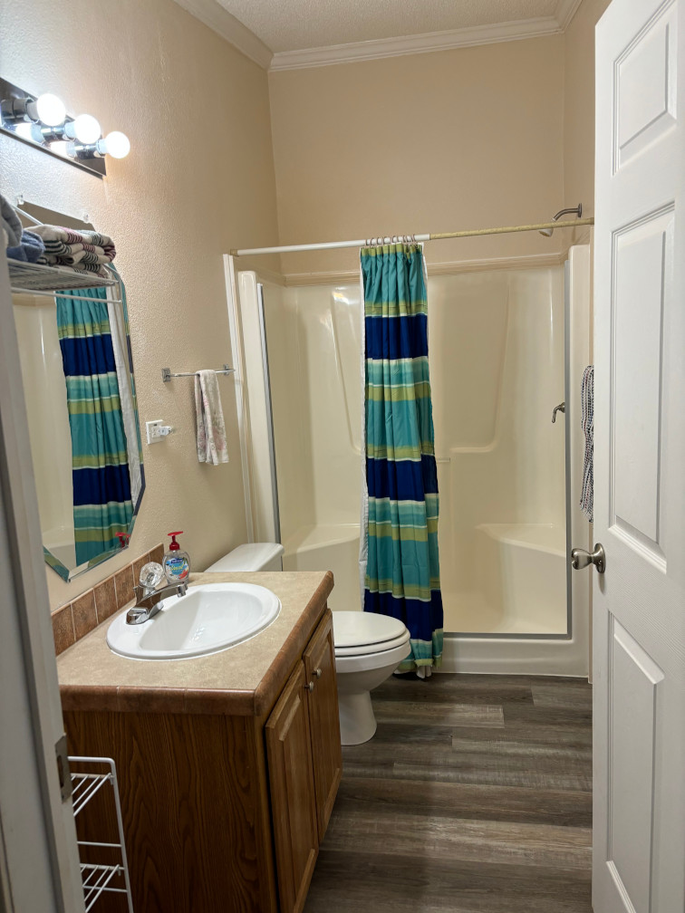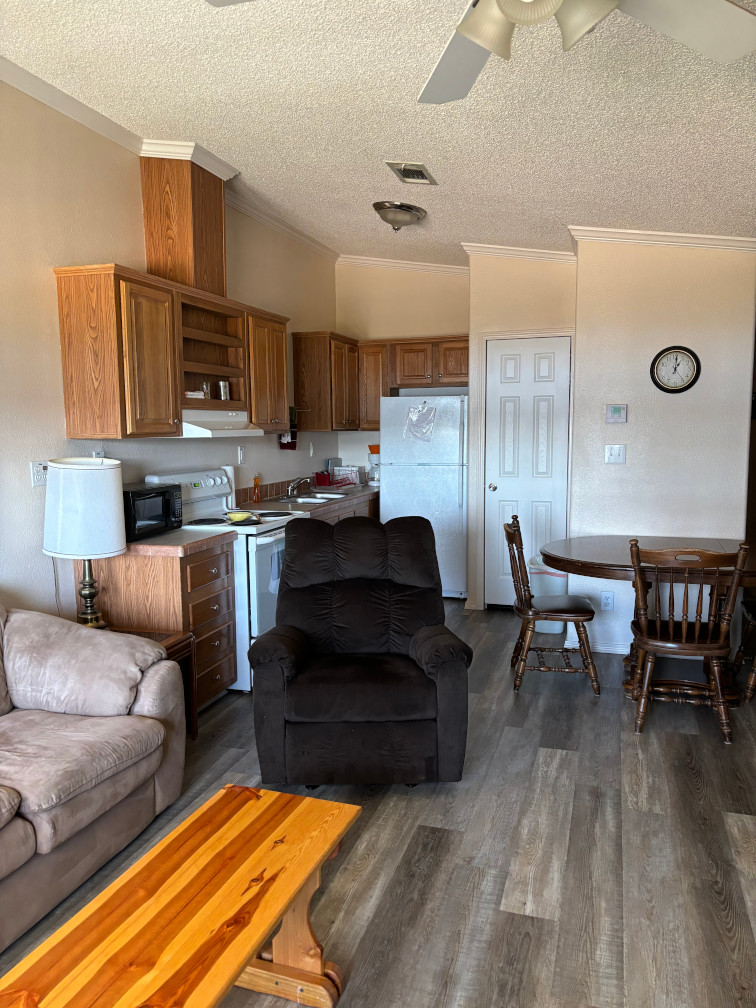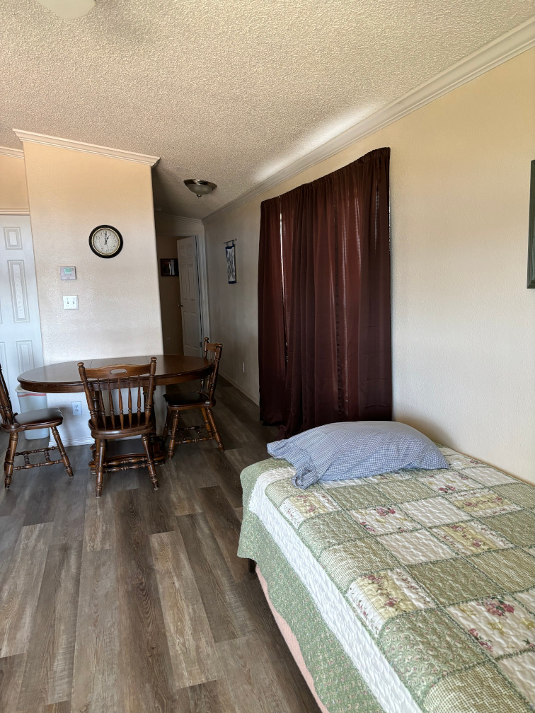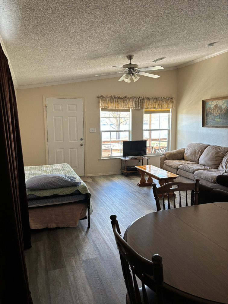 A cabin with 1 bedroom with a king and 2 twin beds off the living area, lake view and covered desck and walk up ramp.
