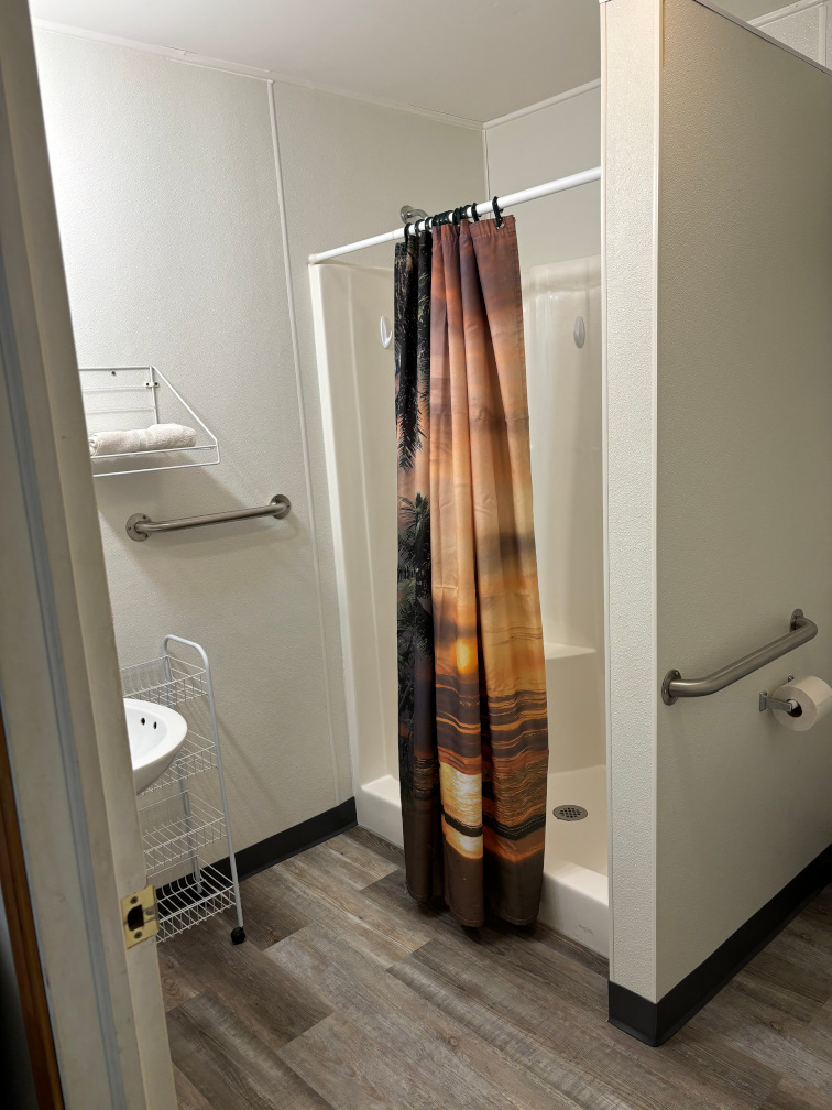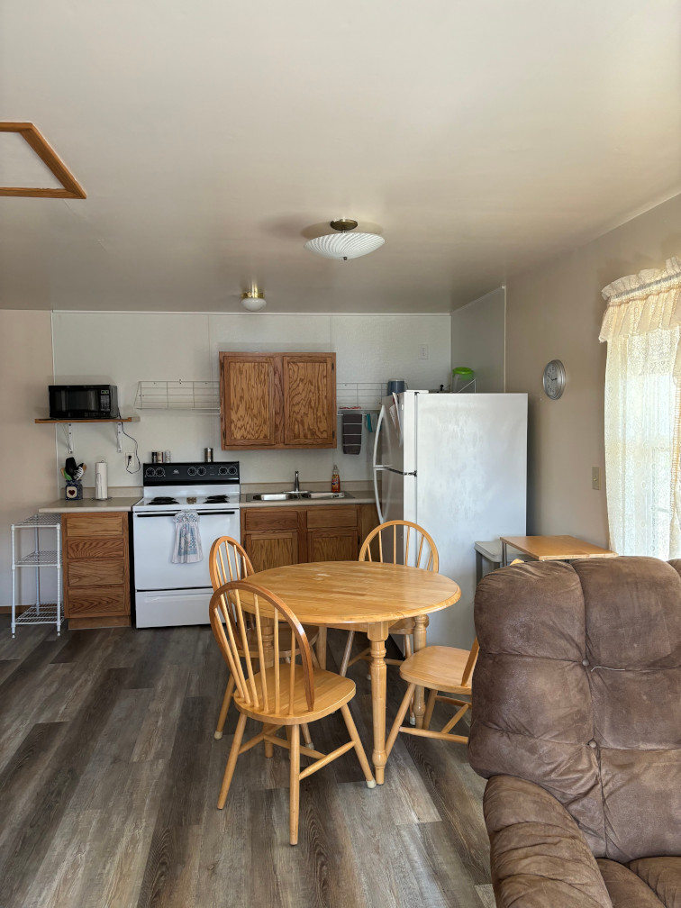 Open floor plan with 2 queen sized beds, lake view, covered deck and walk up ramp.