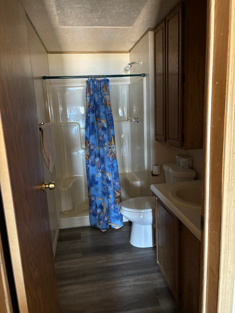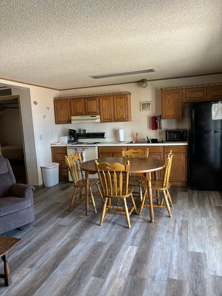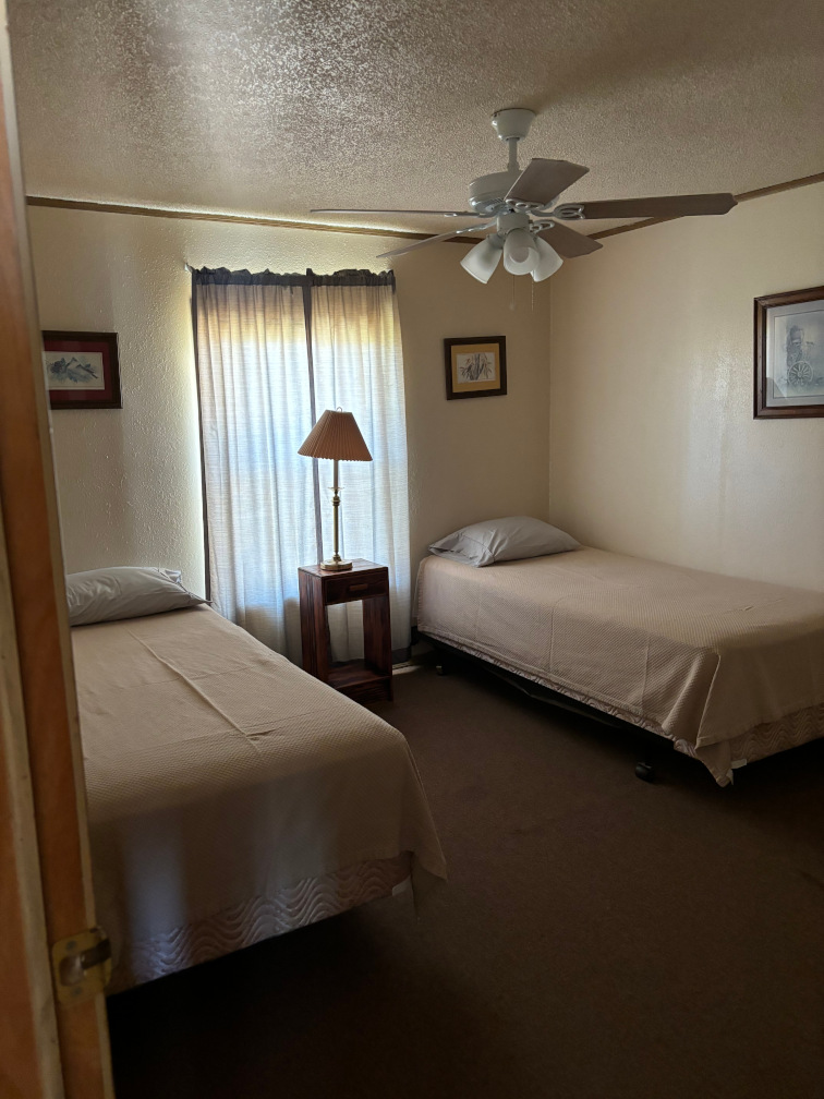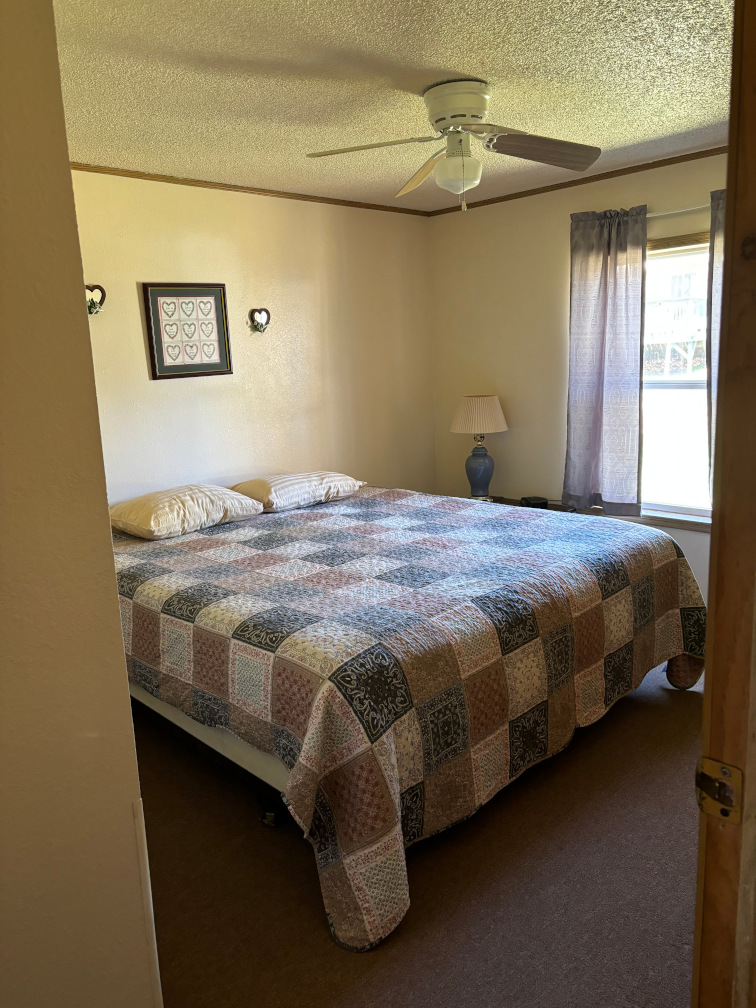 A 2 bedroom cabin with 1 king and 2 twin sized beds, lake view and a covered deck.