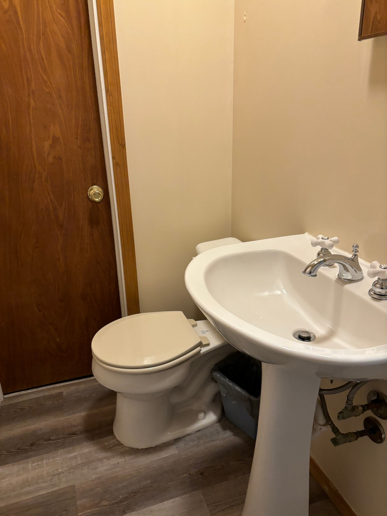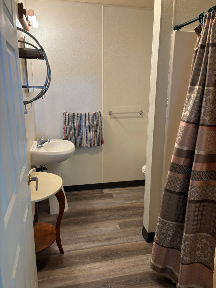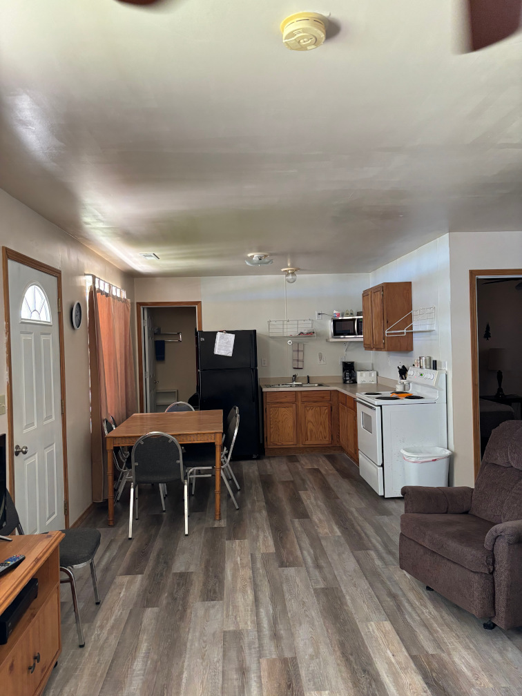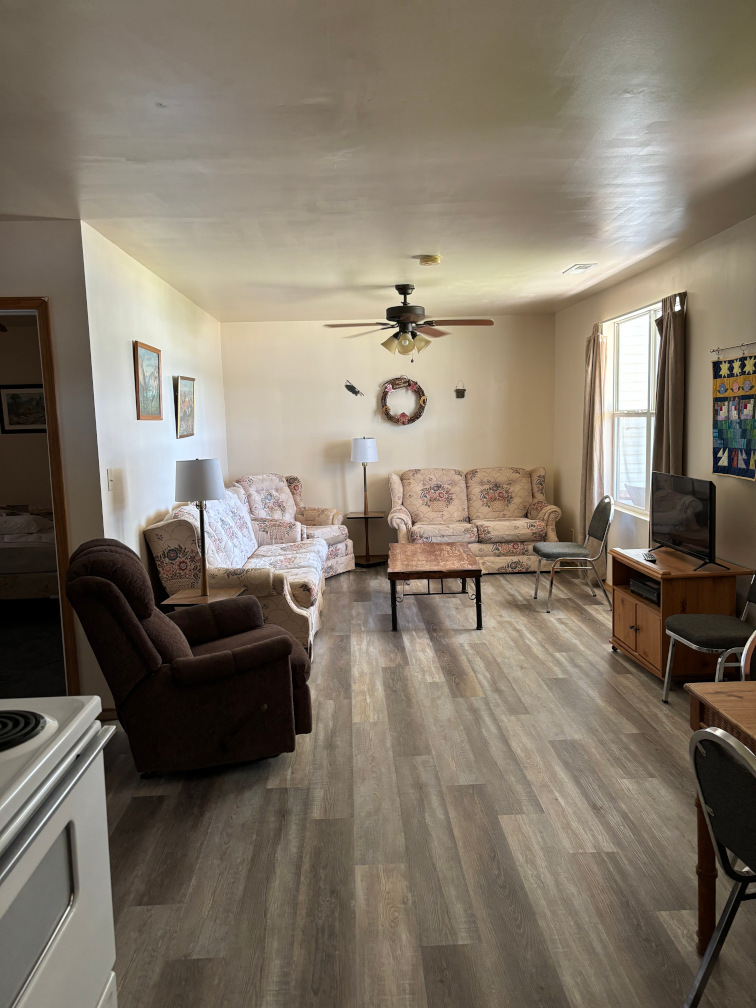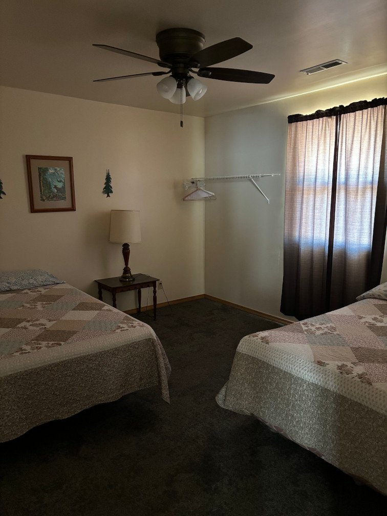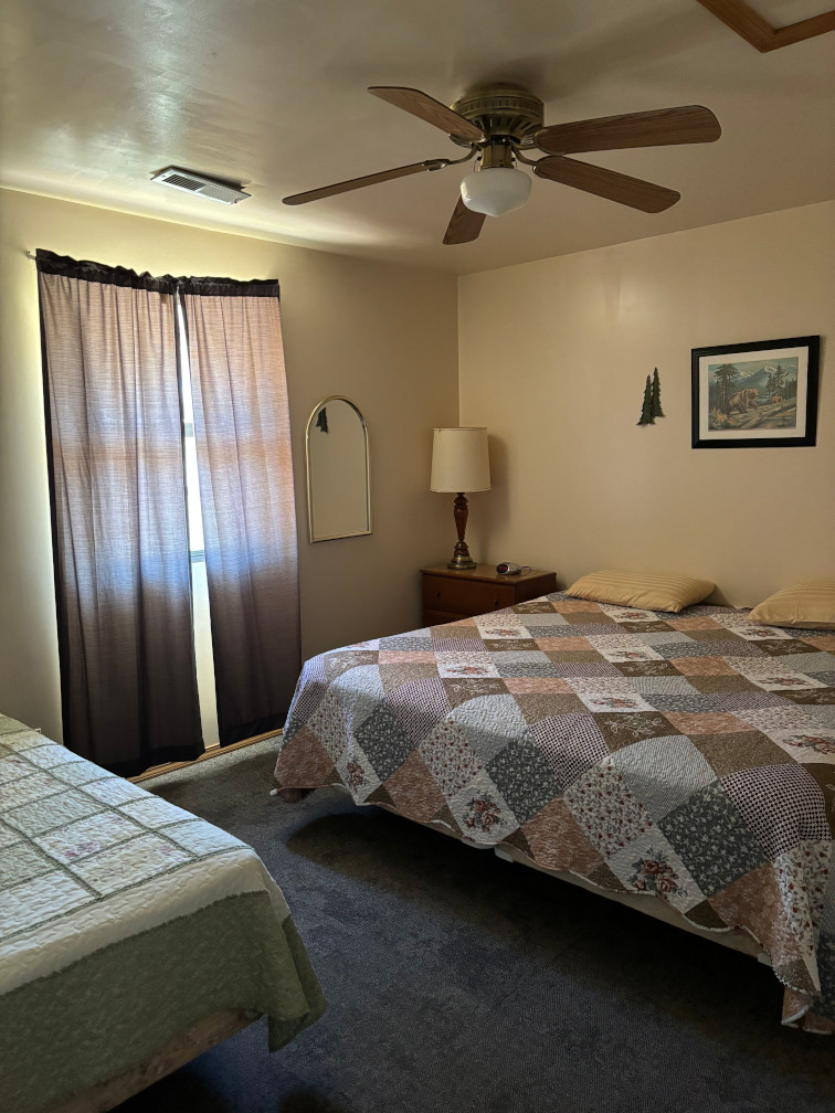 A ground level cabin with 2 large bedrooms, 1 king, 1 queen, 1 full and 1 twin sized beds, one and a half baths, lake view and covered patio.