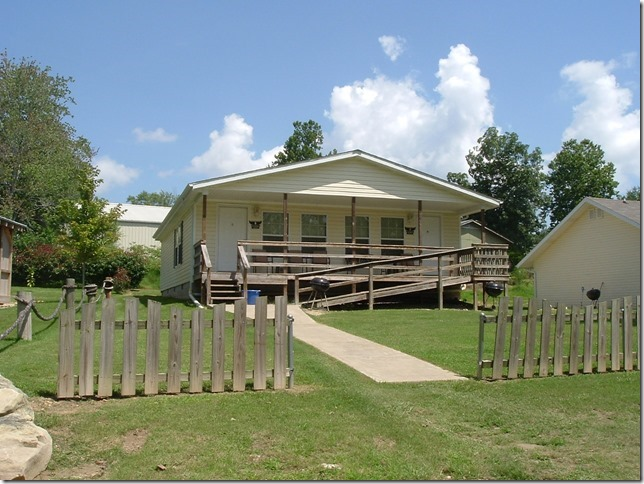 A cabin with 1 bedroom with a king and 2 twin beds off the living area, lake view and covered desck and walk up ramp.