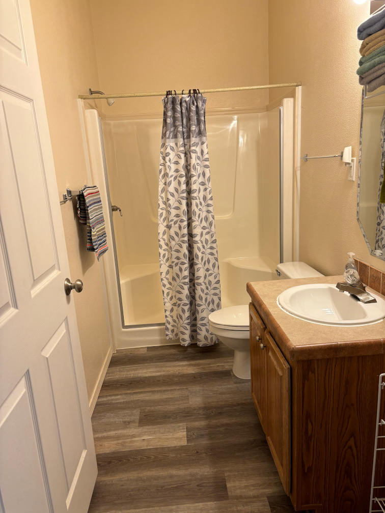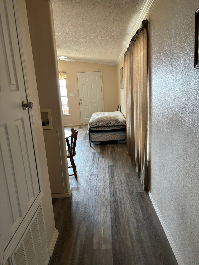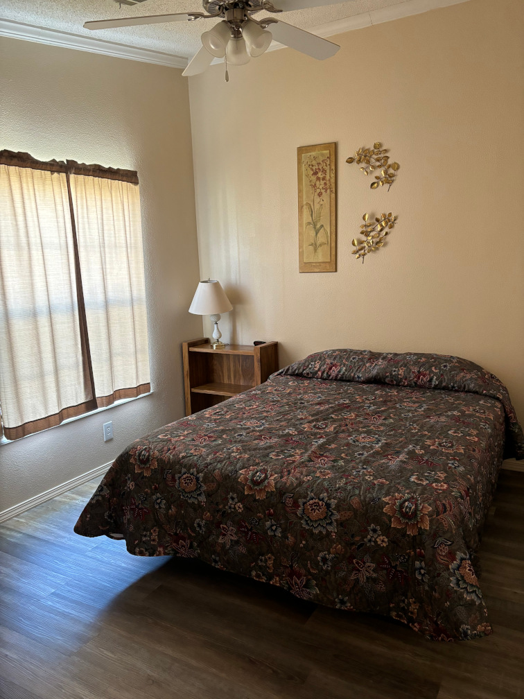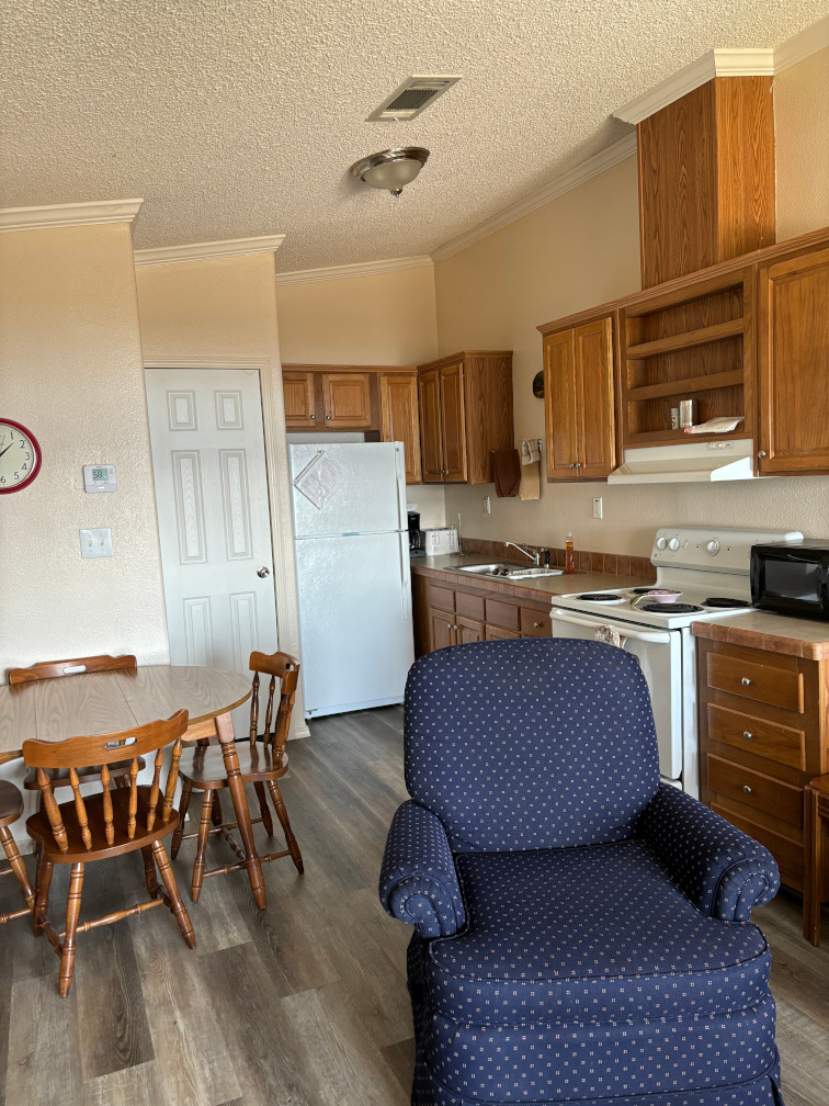 A 1 bedroom cabin with 1 queen and 2 twin beds off the living area, lake view, covered deck and walk up ramp.